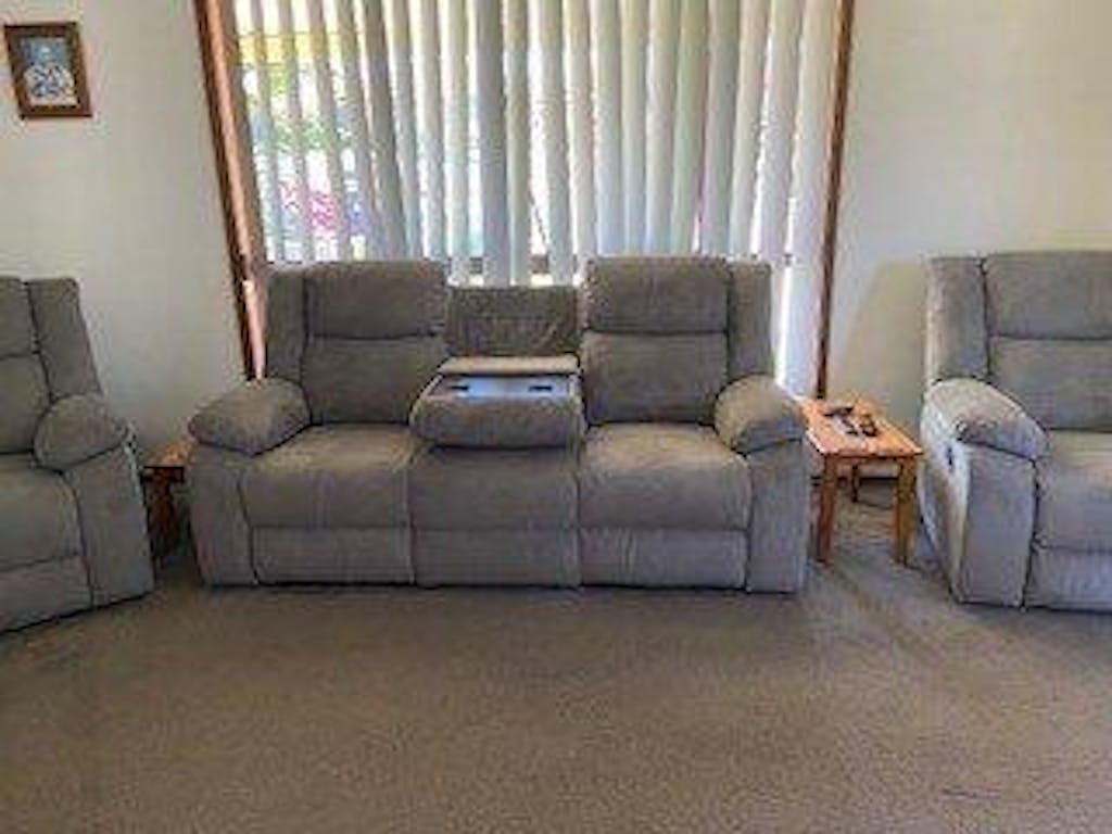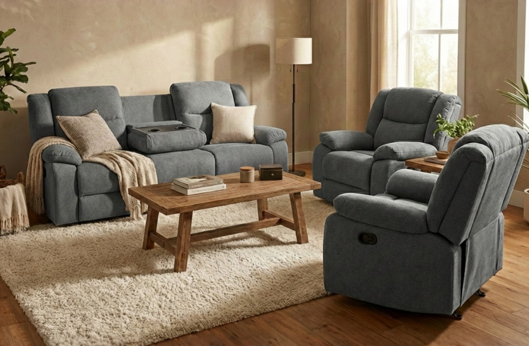 The Rancher Lounge is our best-selling recliner suite. It features 4 recliner actions and is upholstered in a durable polyester fabric in a mid-grey tone. Bonus drop-down tray featured internally in the middle seat of the 3 seater. Super comfortable and remarkably well-made. This is a bargain buy for family living.